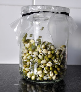Durante a semana germinei feijão mung, e hoje já tenho uns belos rebentinhos para fazer optimas saladas.